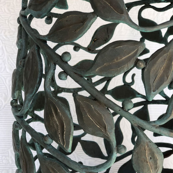 Classic amphora shape with bronze open-work motif of vines and leaves. The Origin series explores mass and openness; a drawing in space that wraps the shape of an ancient vessel with the organic lines of growth.